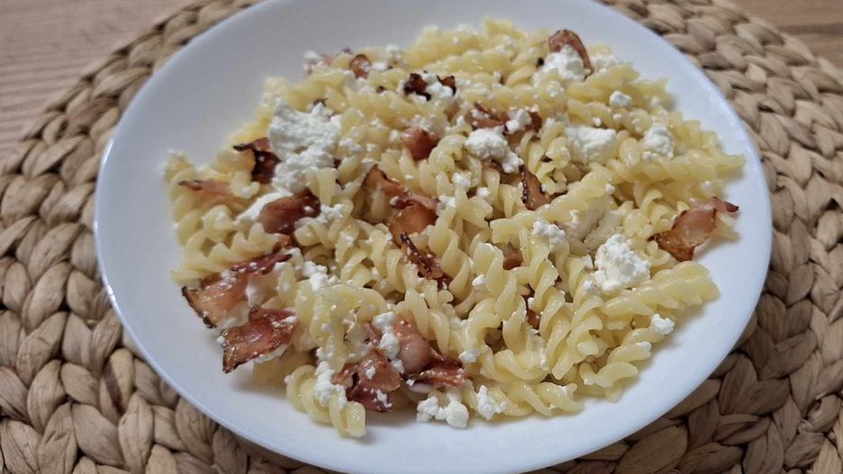 - Wyławiamy go łyżką cedzakową i od razu mieszamy z pokruszonym twarogiem, i boczkiem. Posypujemy szczypiorkiem.