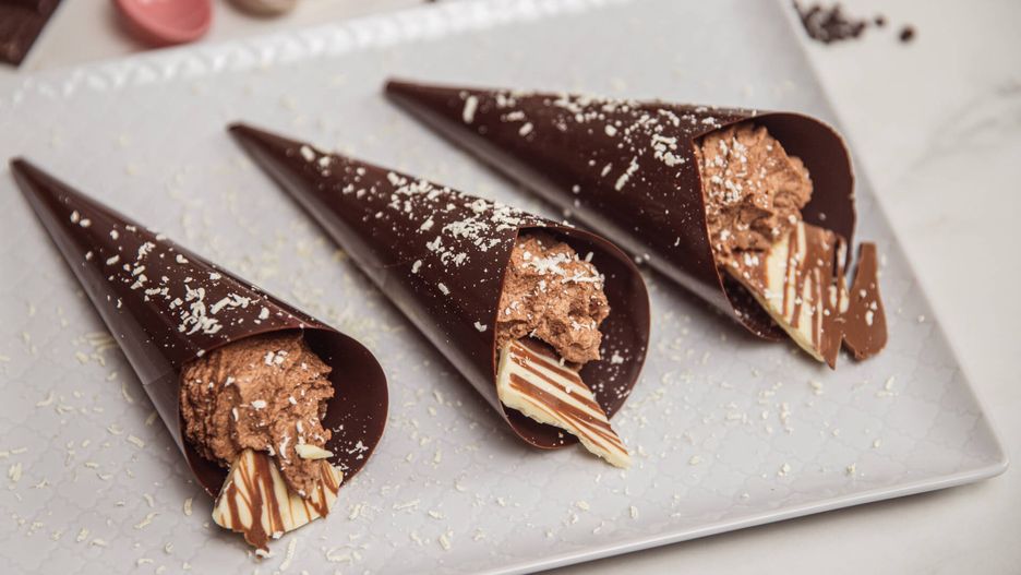 Czekoladowe desery bez pieczenia to coś, co kochamy najbardziej. Są miłą odmianą od typowych ciast, które znają już wszyscy. Dziś przygotowaliśmy przepis na rożki z czekolady, które wypełniliśmy po brzegi równie mocno czekoladowym nadzieniem. Są proste i efektowne. Świetnie sprawdzą się na rodzinne przyjęcia, kinderparty i miłe spotkania w gronie najbliższych. Możesz sam korpus przygotować dzień wcześniej i dopiero przed podaniem wypełnić go nadzieniem.