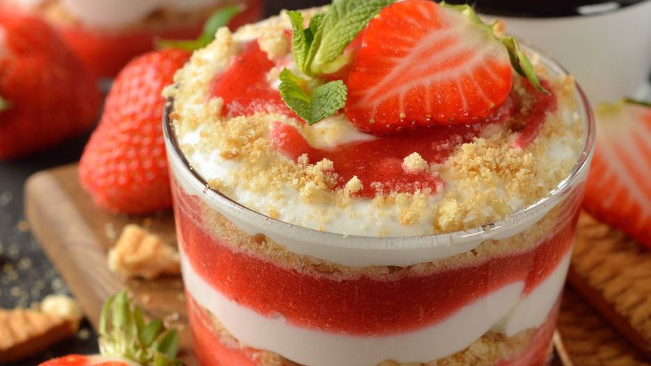 - W pucharkach układaj warstwowo mus truskawkowy, biszkopty naszącone w soku lub Prosecco i krem mascarpone.