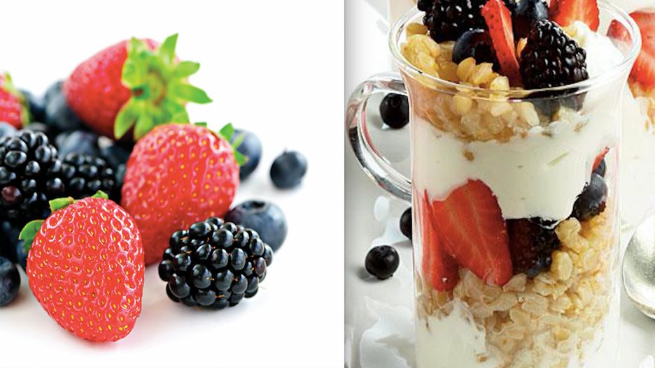 2. Do każdej z 8 szklanek nałóż kolejno: po 60 g jogurtu greckiego, po 3 łyżkach ryżu brązowego i po 2 łyżkach twoich ulubionych owoców. Następnie powtórz te same warstwy z pozostałych składników.