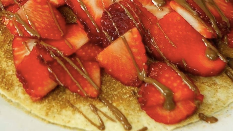 4. Przełóż tortillę na talerz. Posyp ją cukrem cynamonowym, rozłóż truskawki i polej stopioną czekoladą mleczną.