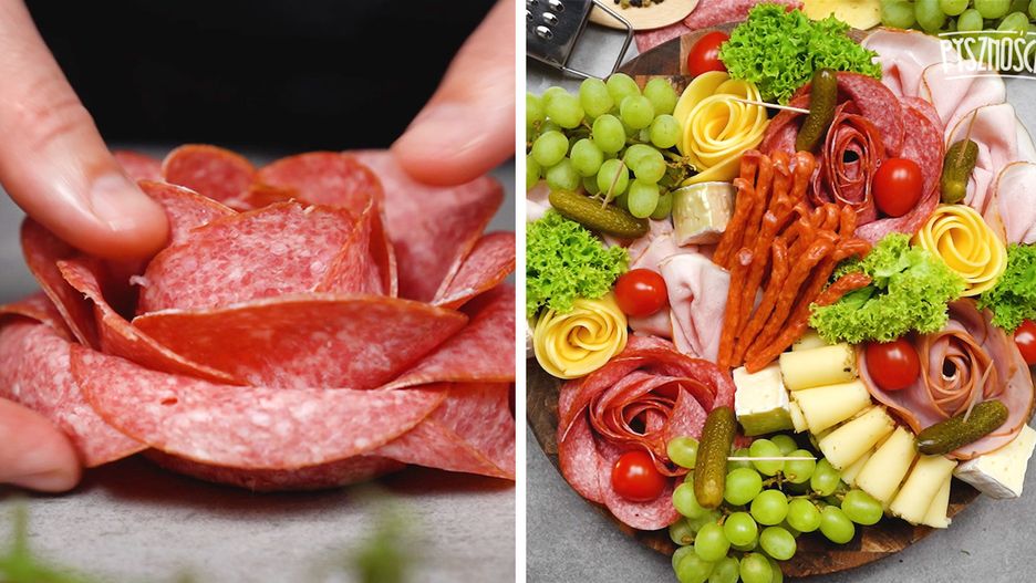 Z salami stwórz róże- ułóż je na szklance lub kieliszku, zaginając w połowie plasterki na brzegu naczynia. Następnie odwróć szklankę i róża gotowa.