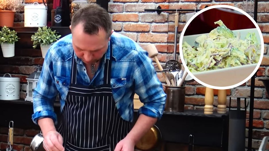 Chociaż bazą tutaj jest kapusta, to Tomasz Strzelczyk sugeruje, by wybrać mniej popularną odmianę. Kapusta szpiczasta jest o wiele bardziej miękka i przyjemna w jedzeniu. Do poszatkowanej kapusty dodajemy czerwoną cebulę i ogórka szklarniowego, pozbawiając go wcześniej wodnistego środka, aby uniknąć rozmoczenia surówki.