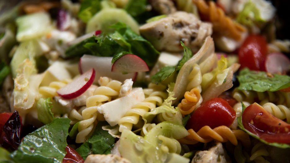 Do makaronu dorzucam kurczaka i warzywa. W kilka minut mam sałatkę niedzielną