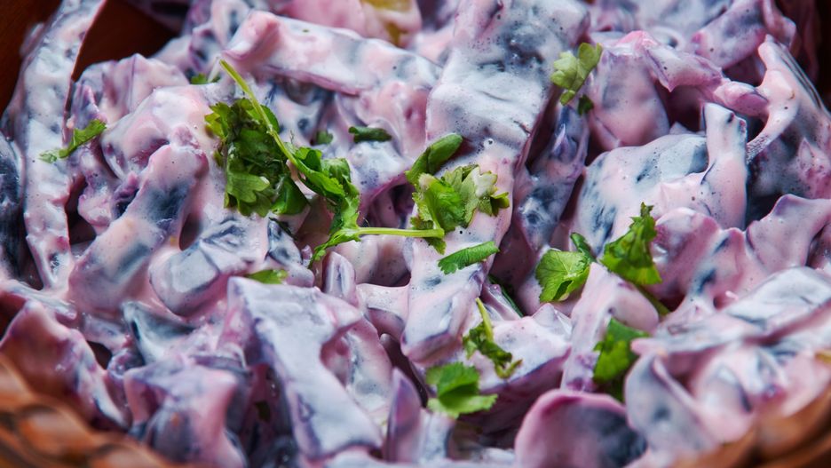 Tak przygotowana surówka najlepiej smakuje w towarzystwie pieczonego drobiu, domowych kotletów mielonych lub jako wypełnienie do wegetariańskich tortilli. Jeśli chcesz wzbogacić jej smak o dodatkową teksturę, możesz dodać do masy garść uprażonych płatków migdałów lub drobno pokrojone kwaśne jabłko. Pamiętaj, aby przed samym nałożeniem na talerze udekorować wierzch świeżą zieleniną, co stworzy piękny kontrast z fioletowo-różową bazą dania.
