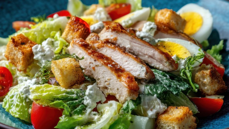 Prosta sałatka z kurczakiem i jajkami inspirowana kultowym Cezarem