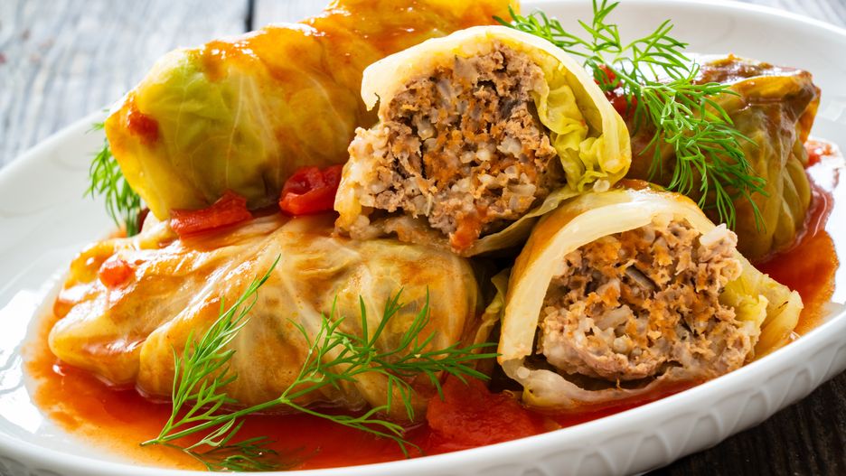- Na każdym liściu kapusty umieść porcję farszu i formuj gołąbki. Wyłóż naczynie żaroodporne olejem, ułóż w nim gołąbki, polej sosem i przykryj pozostałymi liśćmi kapusty.