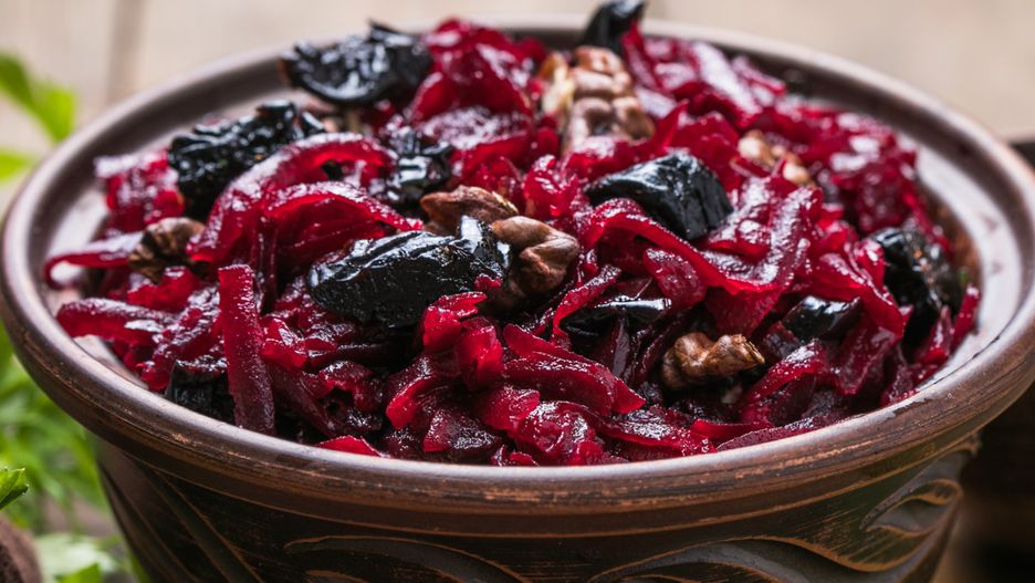Sałatka z buraków ze śliwką i orzechami to nie tylko smakowity dodatek do obiadu, ale także zdrowa przekąska. To zestaw pełen witaminy C, A i K, witamin z grupy B, kwasu foliowego, magnezu, żelaza, potasu, fosforu i cynku