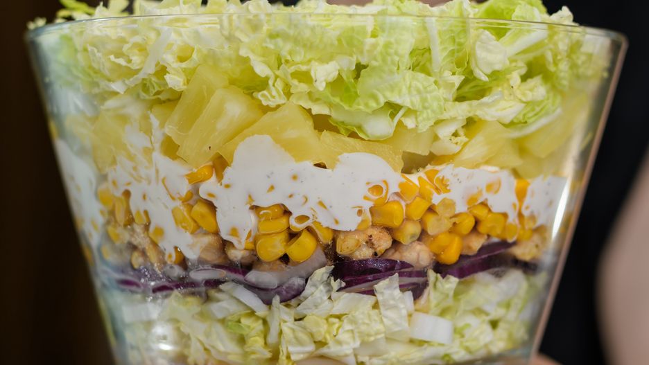 - Do dużej, przezroczystej miski układaj warstwy: połowa kapusty, cebula, kurczak, kukurydza, połowa sosu, ananas, pozostała pekińska i reszta sosu.