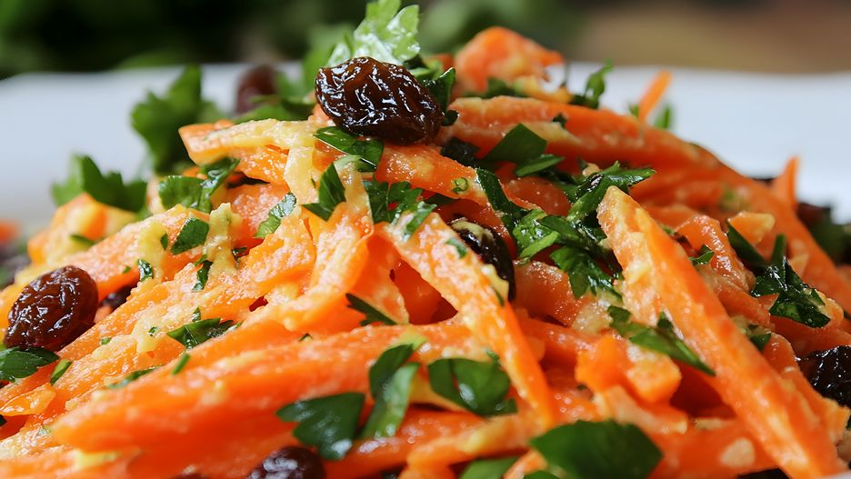 Marchewka to prawdziwa bomba witaminowa – bogata w beta-karoten, błonnik i przeciwutleniacze. Dodanie rodzynek wprowadza słodycz i jeszcze więcej wartości odżywczych, a sos z miodem i imbirem dodaje charakteru i lekko rozgrzewającego aromatu.