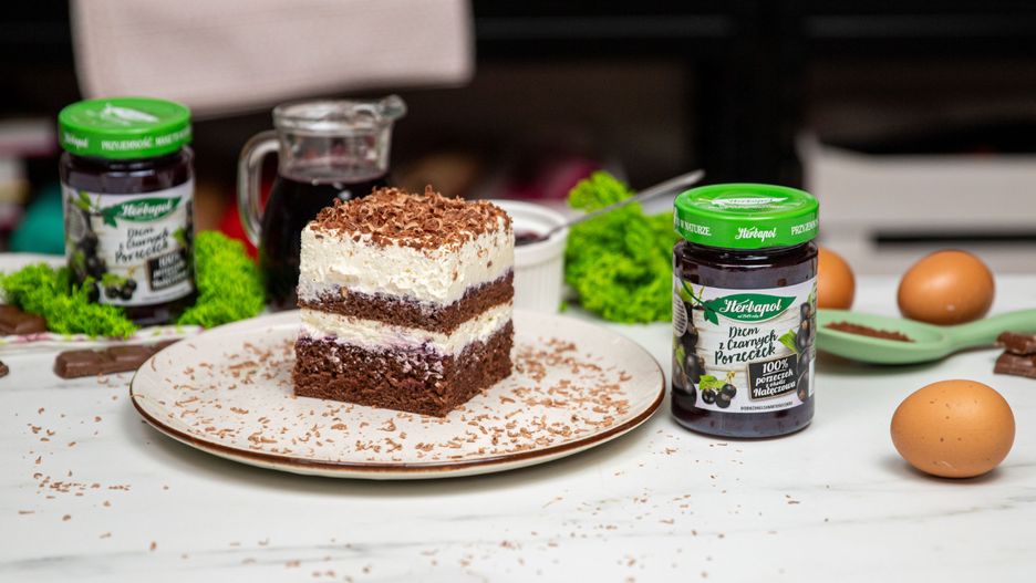 Krok 6. Czas złożyć ciasto. Upieczony biszkopt dzielę na pół przez całą długość, po czym jedną część umieszczam w formie do pieczenia. Ciasto polewam następnie sokiem z czarnych porzeczek, zaś kolejną warstwę robię z dżemu Herbapol z czarnych porzeczek.