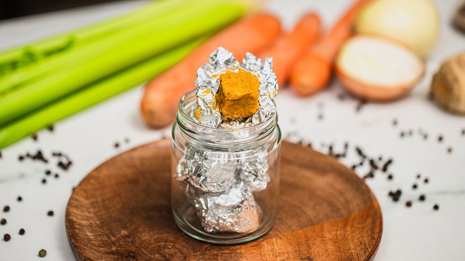 Tak przygotowane kostki zawiń w kawałki folii aluminiowej. Gdy będziesz potrzebować bulion, wystarczy wrzucić przygotowaną kostkę do gorącej wody. Przechowuj w chłodnym miejscu. Gdy włożysz gotowe kostki do zamrażarki, to będą zdatne do użycia nawet przez kilka tygodni.