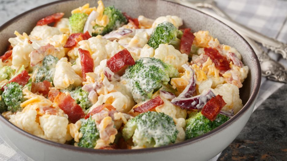 Sałatka brokułowa często występuje w wersji z serem feta i pestkami słonecznika. Do takiego zestawu świetnie pasuje lekki sos z oliwą, miodem i sokiem z cytryny. Jednak tym razem postawiłam na bardziej wytrawną wersję. Różyczki brokułu połączyłam z kalafiorem, dodałam smażony boczek, a całość wymieszałam z kremowym sosem na bazie jogurtu greckiego.