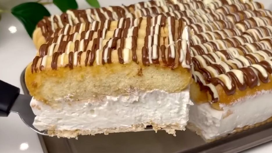 Teraz ułóż na wierzchu namoczone w mleku biszkopty. Krem z orzechów przełóż do rękawa cukierniczego i wyciśnij go na biszkopty. To samo zrób ze stopioną białą czekoladą. Wykonaj to w taki sposób, by uzyskać apetyczne szlaczki z obu produktów.