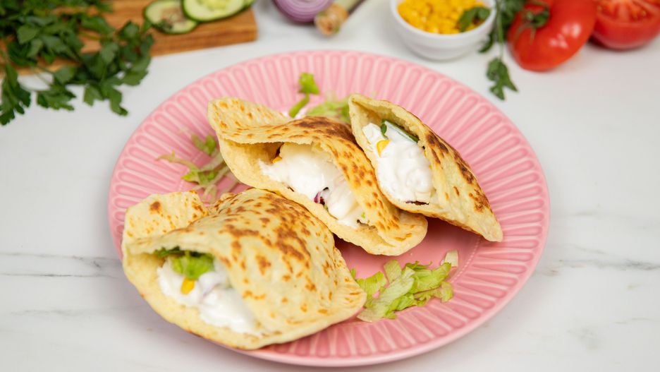 Krok 4. W usmażonych plackach robię kieszeń przy pomocy zwykłych nożyczek, po czym wypełniam każdy element ulubionymi dodatkami. Tym razem postawiłam na mieszankę sałaty lodowej, pomidora, kukurydzy, zielonego ogórka, fety, czerwonej cebuli oraz sosu czosnkowego. Oczywiście nic nie stoi na przeszkodzie, aby dodatki dobrać pod własne upodobania. W przepisie mogą pojawić się również mięsne kęski, jak chociażby kawałki kurczaka w aromatycznej marynacie upieczone w piekarniku lub usmażone na patelni.