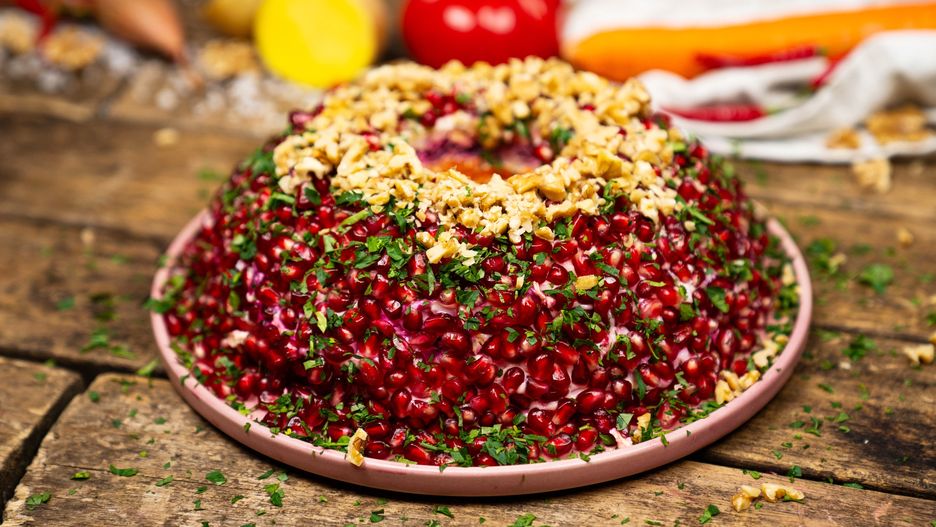 Do przygotowania takiej sałatki niepotrzebne są żadne specjalne foremki ani sprzęt — wystarczy płaski talerz, szklanka i odrobina kreatywności. Warstwowy torcik przypomina nieco kultową sałatkę jarzynową, ale znaleźć w nim można kurczaka oraz granat, który dodaje koloru i wprowadza świeżą, nieco cierpką nutę.