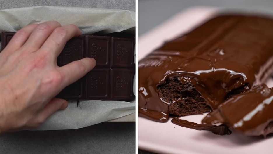Prostokątną blaszkę wyłóż papierem do pieczenia i przelej do niej czekoladową masę. Całość wstaw do piekarnika rozgrzanego do 170 stopni Celsjusza i piecz przez 15 minut. Po 15 minutach wyjmij formę z piekarnika i umieść na wierzchu tabliczkę czekolady. Ponownie wstaw formę do piekarnika. Tym razem piecz ciasto przez 10 minut w temperaturze 160 stopni Celsjusza.