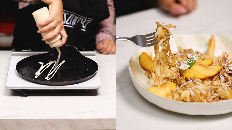 - Następnie weź butelkę do ręki i zacznij rozlewać ciasto naleśnikowe w taki sposób, aby na patelni zaczęły powstawać nitki przypominające makaron.