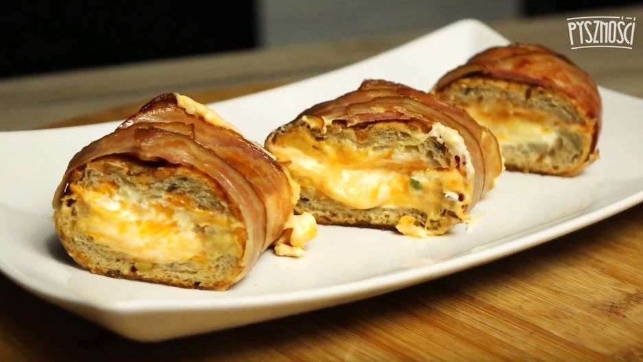4. Każdą bułkę owiń przy pomocy plastrów boczku.