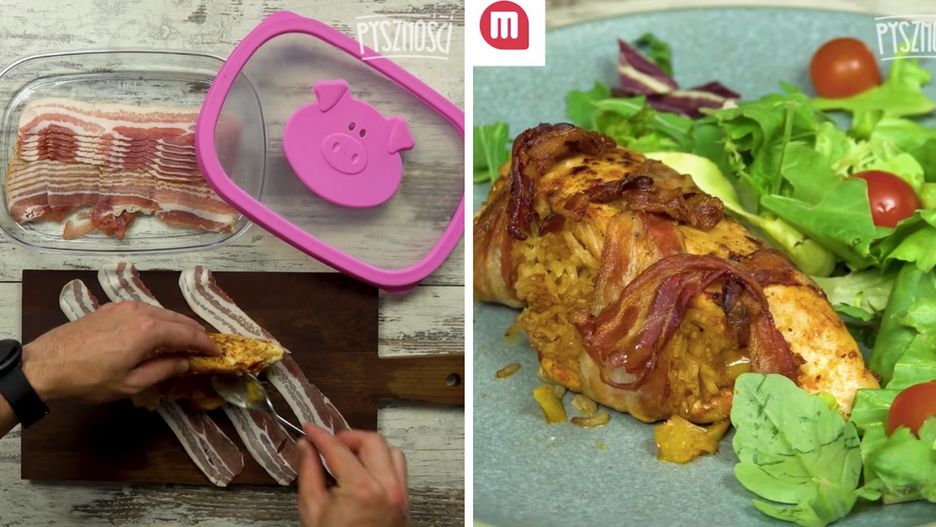 Faszerowany kurczak w boczkowych kokardkach