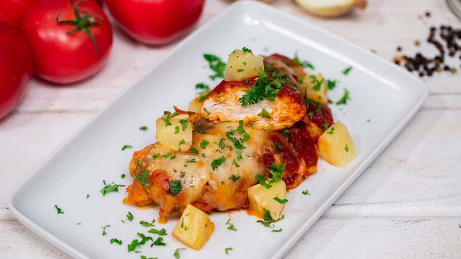 Kiedy już skończysz smażyć kawałki kurczaka na patelni, przełóż je do formy do pieczenia. Układając kawałki blisko siebie. Na wierzchu rozprowadź przygotowany wcześniej sos BBQ. Jako kolejne składniki dodaj do formy startą mozzarellę oraz małe kawałki ananasa.