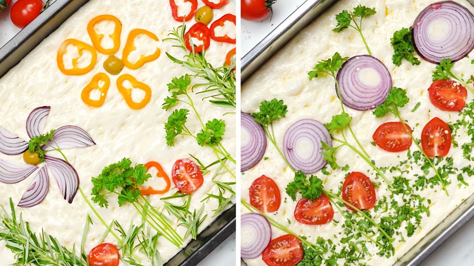 Teraz przejdź do najprzyjemniejszej części, czyli dekoracji naszej focacci. Pierwszy pomysł to wykorzystanie świeżego rozmarynu i warzyw, aby stworzyć na cieście piękną łąkę. Całość posyp suszonym tymiankiem, solą oraz pieprzem. Na koniec polej oliwą i piecz przez 20 minut w 220 stopniach Celsjusza.