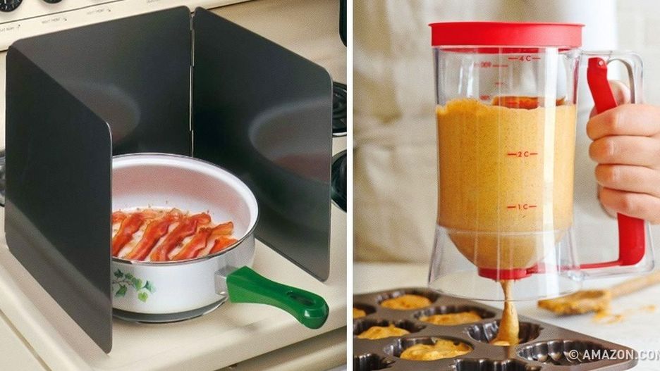 4. Osłona na patelnię <a href="https://www.amazon.com/3-SIDED-SPLATTER-SHIELD-GUARD/dp/B008E06YYE/ref=pd_sim_79_4?_encoding=UTF8&pd_rd_i=B008E06YYE&pd_rd_r=61005EC21SG5FXX421CA&pd_rd_w=zrjma&pd_rd_wg=uVe0n&psc=1&refRID=61005EC21SG5FXX421CA" target="_blank">© amazon.com</a> Koniec z tłuszczem pryskającym podczas smażenia.
