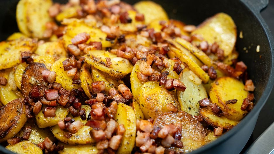 - Po 10 minutach dodaj pokrojoną cebulę, czosnek i boczek. Podsmażaj razem przez kolejne 10 minut, a następnie przykryj patelnię pokrywką i duś do momentu, aż ziemniaki będą miękkie.