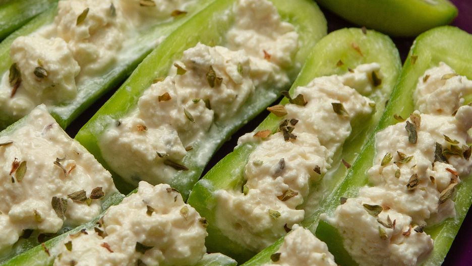 - Gotowym nadzieniem wypełniam ogórkowe łódeczki. Używam do tego łyżeczki albo rękawa cukierniczego, jeśli zależy mi na estetyce. Na wierzchu układam plasterki rzodkiewki lub kiełki, czasem posypuję pestkami dla chrupkości.