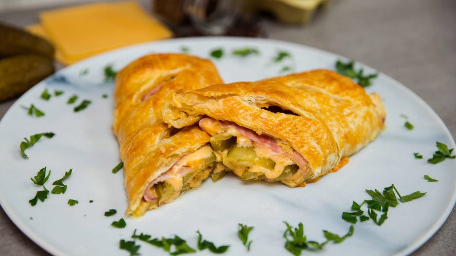 Obłędna rolada z ciasta francuskiego z serem, szynką i ogórkiem
