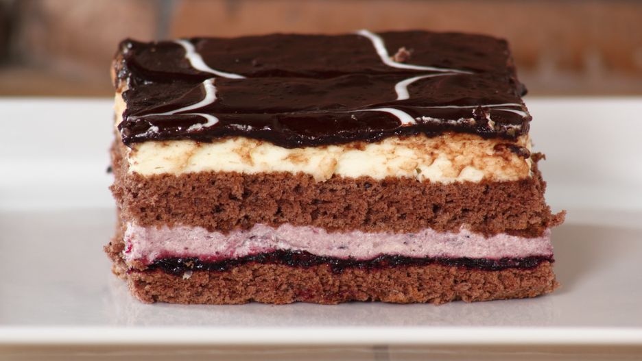 - Czas złożyć to wszystko w całość. Na blat z galaretką wiśniową połóż kawałek ciasta doprawionego makiem. Wyłóż na niego galaretkę agrestową i wstaw do lodówki. Kiedy stężeje, połóż na wierzchu blat ciasta z kakao. Wylej na niego roztopioną w kąpieli wodnej czekoladę.