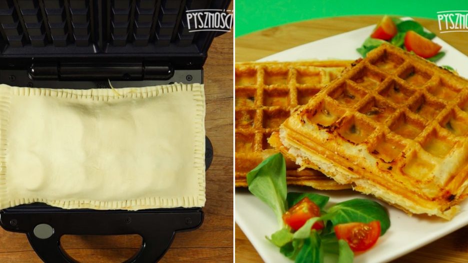 Poniżej zobaczysz przepis na przyrządzenie gofrów z ciasta francuskiego z szynką, serem i pieczarkami.