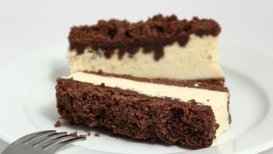 - Mniejszą część ciasta kakaowego również zetrzyj na tarce i posyp nią wierzch masy serowej.
