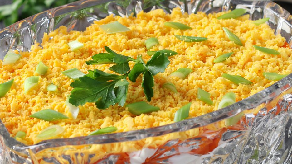 - Majonez wymieszaj z solą i pieprzem i pokryj nim warstwę jajek. Na końcu zetrzyj ser żółty.