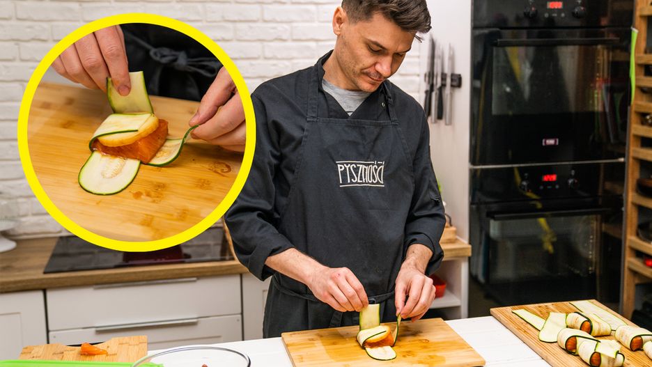 4. Na blacie układam dwa plasterki cukinii na krzyż. Na środku układam kawałek łososia, plaster sera wędzonego i zawijam.