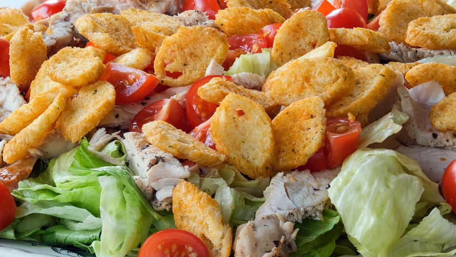 - Sałatę rwę na kawałki, pomidorki kroję na połówki, grzanki przygotowuję z bagietki podsmażonej na oliwie z czosnkiem (albo używam gotowych).