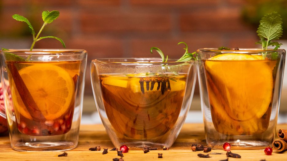 5. Umieść w szklance plastry cytryny, laski cynamonu, pestki granatu, imbir oraz wcześniej przygotowany syrop. Na koniec zalej czarną herbatą.
