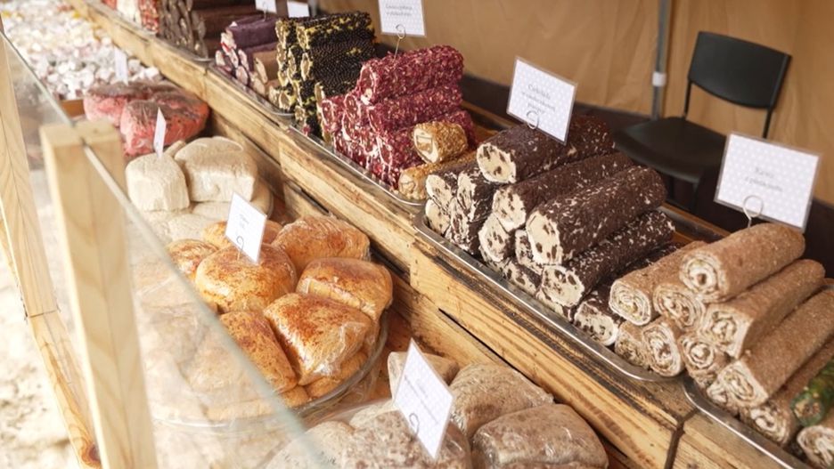 To, co na straganie pierwsze rzuca się w oczy, to właśnie nazwa rachatłukum. Bez tłumaczenia trudno o dobre wyjaśnienie, co to za produkty. A to po prostu rodzaj zwartych, galaretowych wyrobów, które już same w sobie są słodkie, a dodatkowo obtacza się je jeszcze w cukrze. Oryginalnie był to miód, obecnie producenci eksperymentują z posypkami, wiórkami kokosowymi i innymi dodatkami. Na uwagę zasługuje też sucuk, czyli pałeczki z orzechów włoskich pokryte zastygniętym, bardzo słodkim sokiem. Zazwyczaj to sok winogronowy lub sok z granatu. Przysmak zdecydowanie dla mocnych zębów - tekstura i ilość cukru to wyzwanie dla niejednej szczęki. Właściciele stoiska zapewniają jednak, że chętnych na te doznania smakowe nie brakuje.