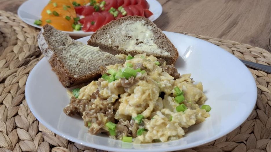 - Wbij jajka, dopraw solą i pieprzem, wymieszaj i smaż do ulubionej konsystencji.