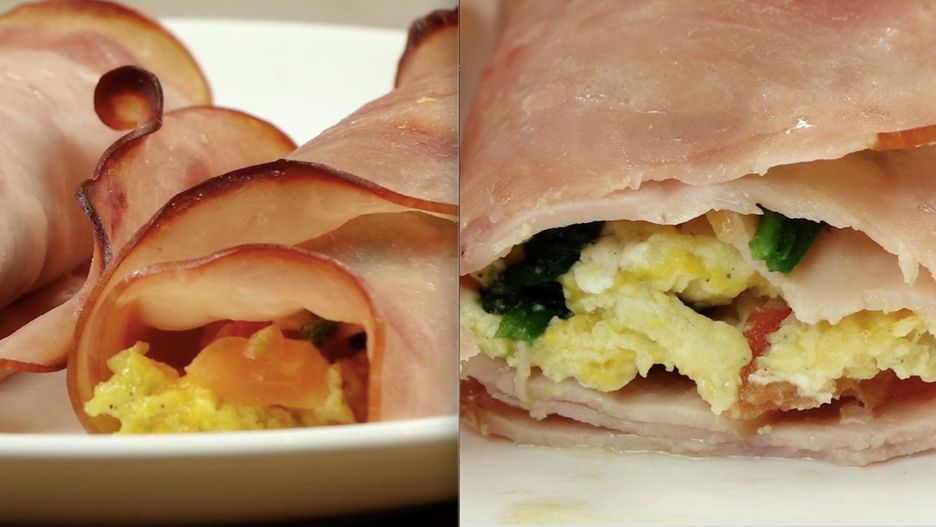 Poniżej zobaczysz przepis na przyrządzenie jajecznicy ze szpinakiem, pomidorami i serem zapiekanej w szynce.