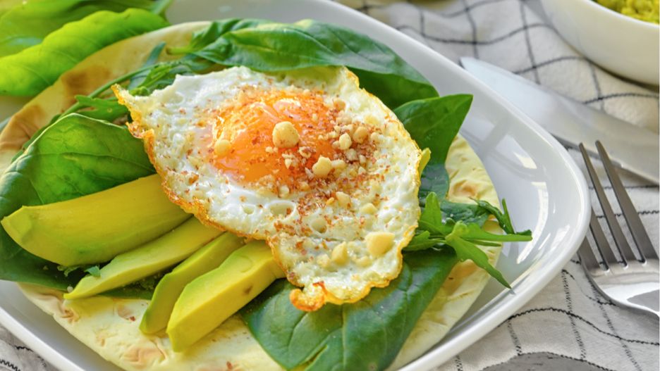 Jajka posyp okruchami z patelni o kokosowym smaku i aromacie. Podawaj z zielonymi dodatkami, na przykład młodym szpinakiem i awokado.