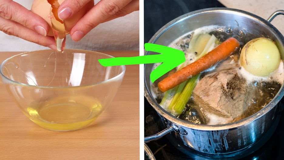 Jajko może posłużyć również w innym konkretnym celu. Jeśli na rosole pojawiła się gruba warstwa tłuszczu, to można się go pozbyć w prosty sposób. Wystarczy wyjąć z zupy mięso i włoszczyznę, dodać białko i gotować na wolnym ogniu, przez cały czas mieszając. Białko się zetnie i pochłonie cały tłuszcz, a wszelkie zanieczyszczenia opadną na dno. Prawda, że proste?