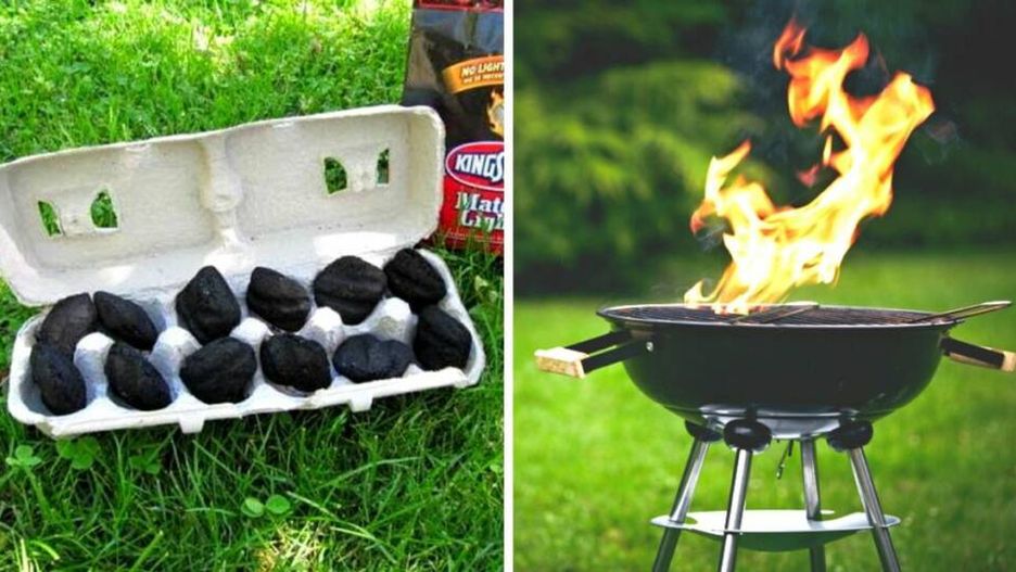 Jak rozpalić grilla, gdy nie ma podpałki? Kawałki węgla ułóż w miejscach po jajkach w wytłaczance.
