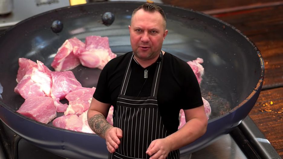 Internetowy przepis, o którym opowiada Strzelczyk, zakładał usmażenie łopatki wieprzowej. Na patelnie trafiła ona, pokrojona w kostkę, dopiero po zeszkleniu czosnku i cebuli. Jak twierdzi YouTuber, w takiej sytuacji mięso puści bardzo dużą ilość wody. Wieprzowina nie zarumieni się więc, za to ugotuje we własnym sosie. Podobne konsekwencje dotyczą samej cebuli i czosnku. Po dodaniu mięsa nie pozostaną ładnie zeszklone: najpierw zrobi się z nich papka, która po odparowaniu wody spali się na wiór.