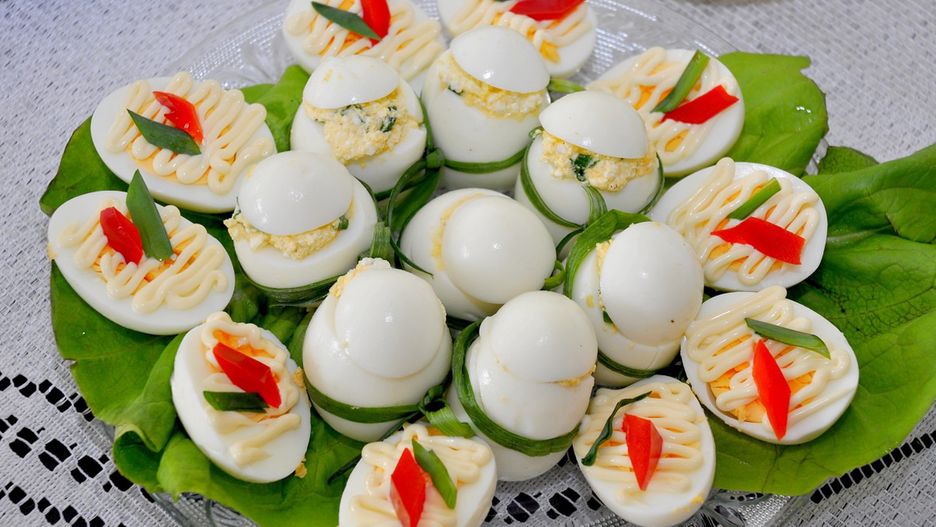 - Napełnij białka gotowym farszem, udekoruj kleksem majonezu i ułóż na liściach sałaty.