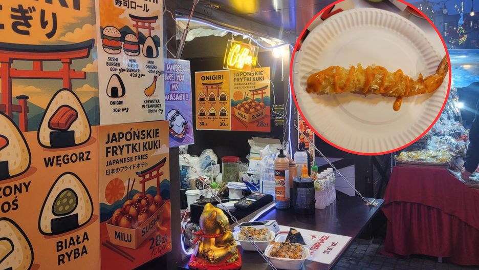 Stoisko przyciąga wzrok od pierwszej chwili: japońskie lampiony, ilustracyjne menu, onigiri, sushi burgery, krewetki w tempurze. Wszystko wygląda jak kulinarna podróż do Tokio, tylko że odbywana w rękawiczkach, przy mrozie i pośpiechu. I niestety — to właśnie temperatura okazała się największym wrogiem tej kuchni.
