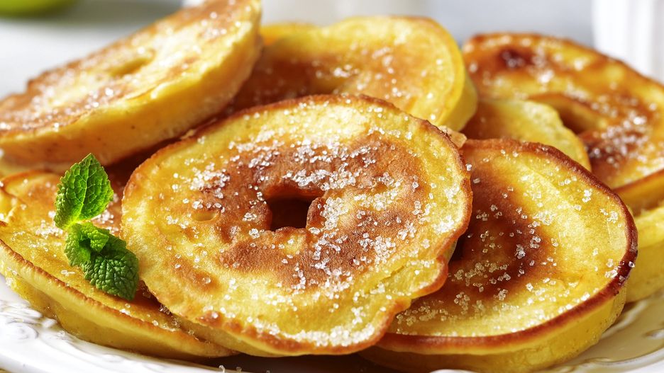 - Rozgrzej patelnię, rozpuść masło. Zamocz plastry jabłek w cieście i usmaż na złoty kolor z obu stron.