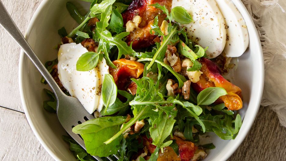 Bazę sałatki stanowi rukola, zwana także rokiettą siewną, która należy wprawdzie do roślin kapustowatych, ale ostatnio jest kojarzona przede wszystkim z sałatami. Wyróżnia się lekko pieprzowym (zdaniem niektórych chrzanowym) smakiem. Im starsza rukola, tym staje się on ostrzejszy. To zasługa wysokiego stężenia aminokwasów siarkowych, które wykazują właściwości bakteriobójcze.