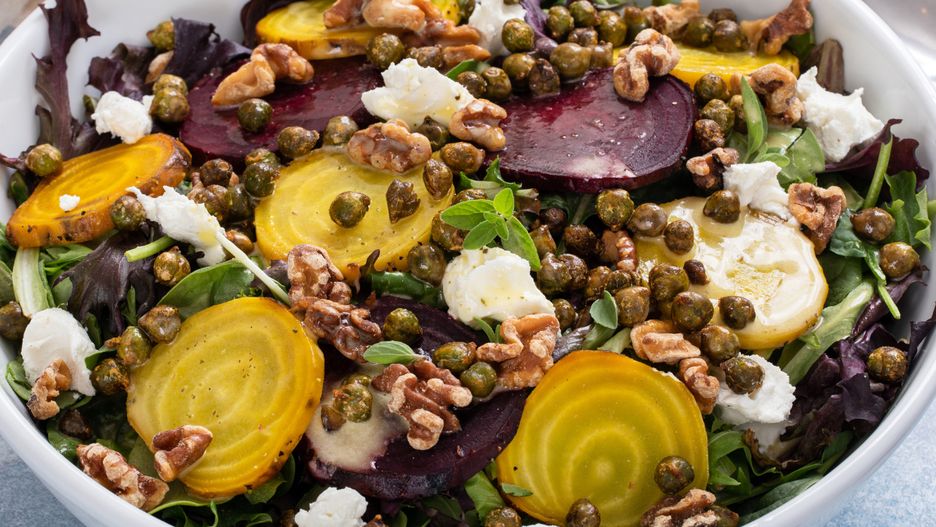 Żeby skorzystać z właściwości zdrowotnych obu wersji, przygotuj sałatkę, która połączy obydwa kolory w lekkiej i pożywnej postaci. Jeśli chcesz przygotować ją z wyprzedzeniem, dressing trzymaj w osobnym słoiczku i polej nim sałatkę tuż przed podaniem. Na koniec warto też zostawić orzechy, aby były przyjemnie chrupiące.
