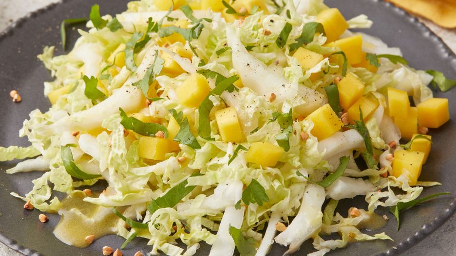 To uniwersalny przepis na surówkę z dodatkiem owoców. Ja wybrałam mango, ale świetnie smakuje również w wersji z mandarynkami, pomarańczą czy ananasem – jeśli używasz świeżego, pamiętaj, aby wyciąć rdzeń, inaczej może szczypać w usta.